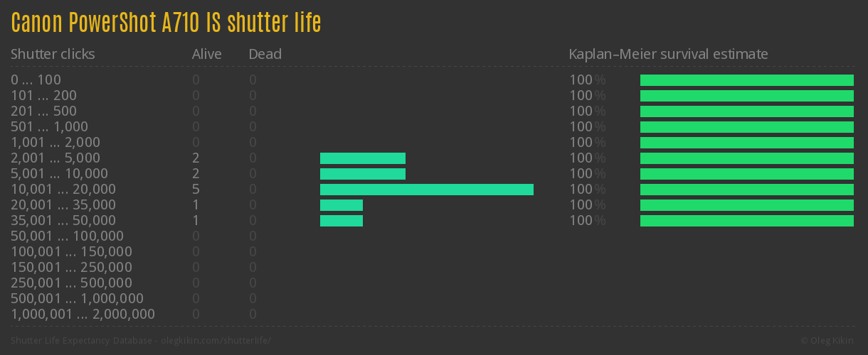 Direct link to this page: Canon PowerShot A710 ISAverage number of actuations after which shutter is still alive: 15,581.0