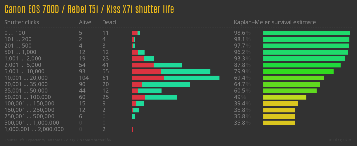Direct link to this page: Canon EOS 700D / Rebel T5i / Kiss X7iAverage number of actuations after which shutter is still alive: 33,101.5