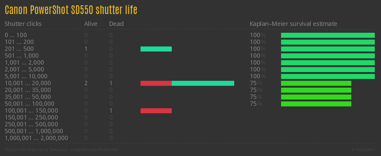 Direct link to this page: Canon PowerShot SD550Average number of actuations after which shutter is still alive: 11,738.3