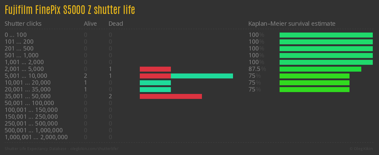 Direct link to this page: Fujifilm FinePix S5000 ZAverage number of actuations after which shutter is still alive: 11,778.5