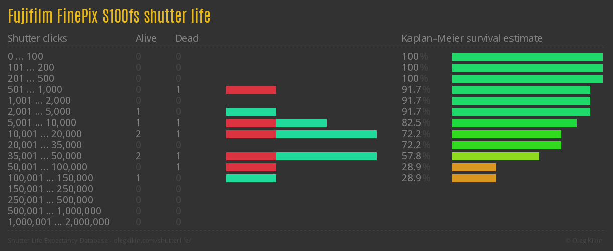 Direct link to this page: Fujifilm FinePix S100fsAverage number of actuations after which shutter is still alive: 41,017.7