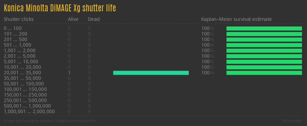 Direct link to this page: Konica Minolta DiMAGE XgAverage number of actuations after which shutter is still alive: 32,000.0