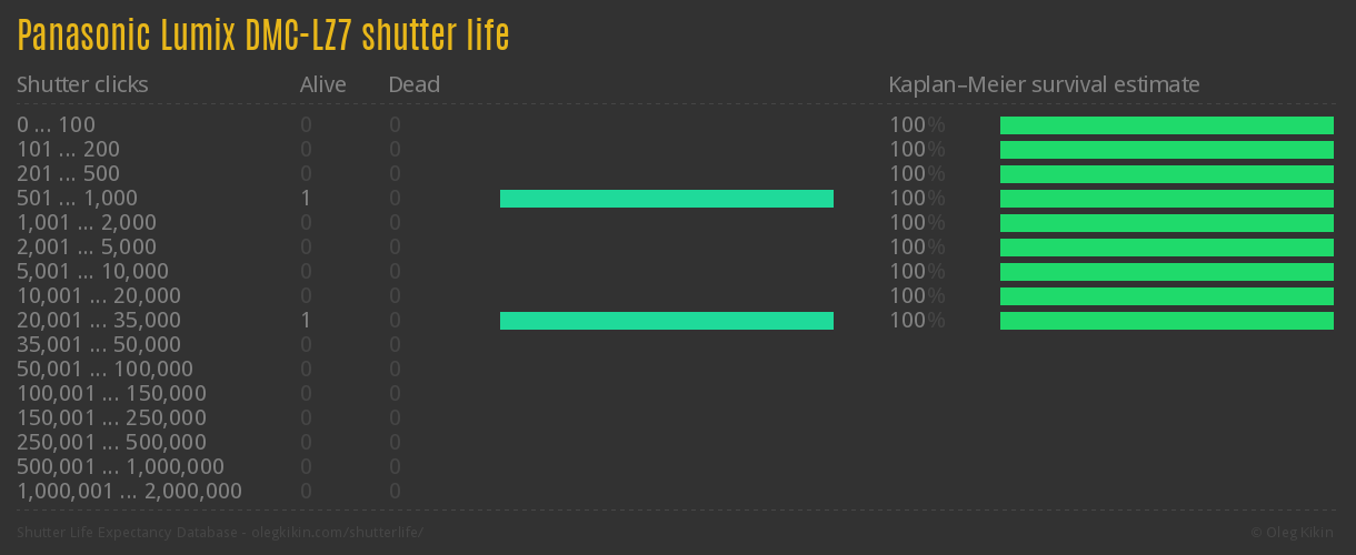 Direct link to this page: Panasonic Lumix DMC-LZ7Average number of actuations after which shutter is still alive: 11,778.5