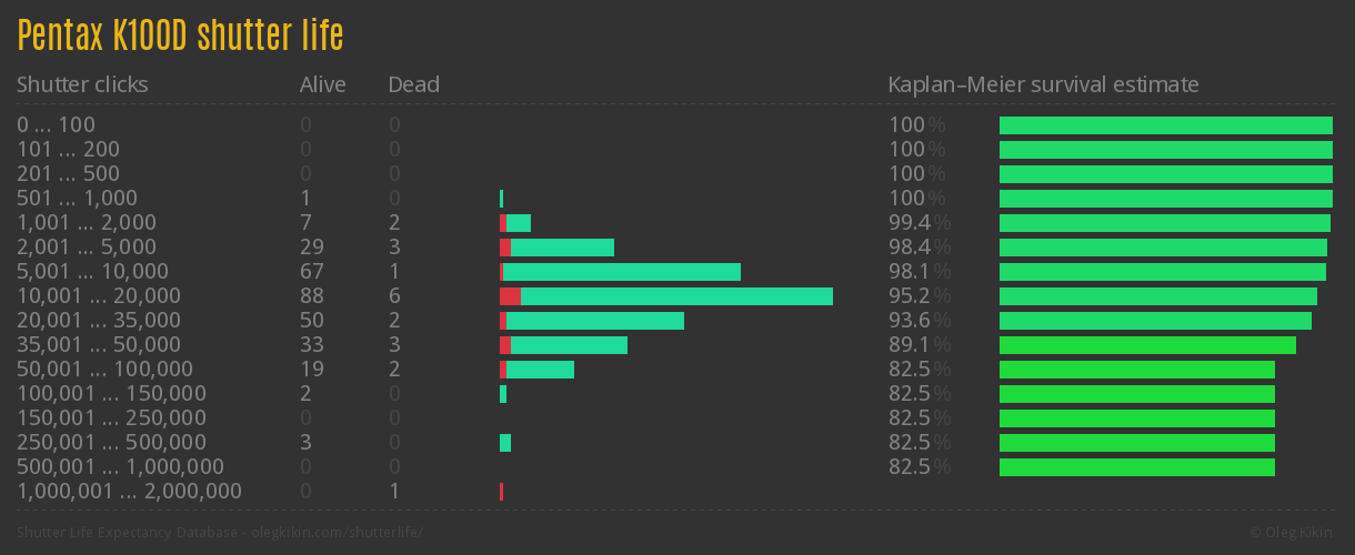 Direct link to this page: Pentax K100DAverage number of actuations after which shutter is still alive: 24,278.6
