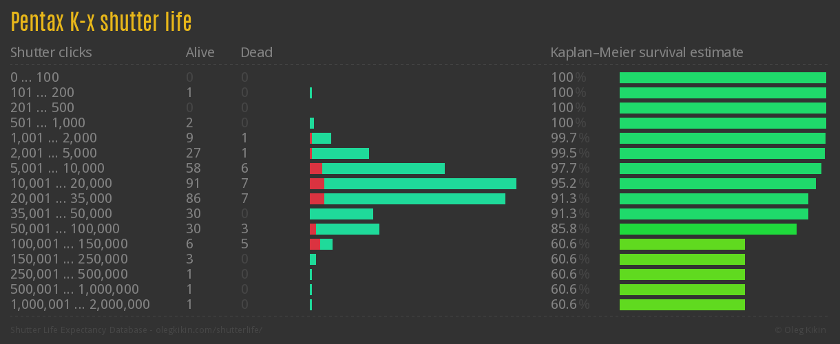 Direct link to this page: Pentax K-xAverage number of actuations after which shutter is still alive: 32,028.1