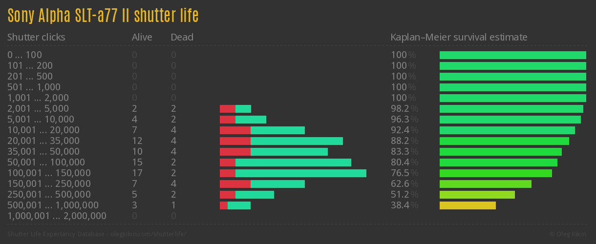Direct link to this page: Sony Alpha SLT-a77 IIAverage number of actuations after which shutter is still alive: 108,918.6