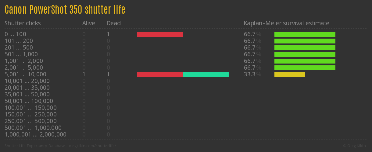 Direct link to this page: Canon PowerShot 350Average number of actuations after which shutter is still alive: 6,000.0