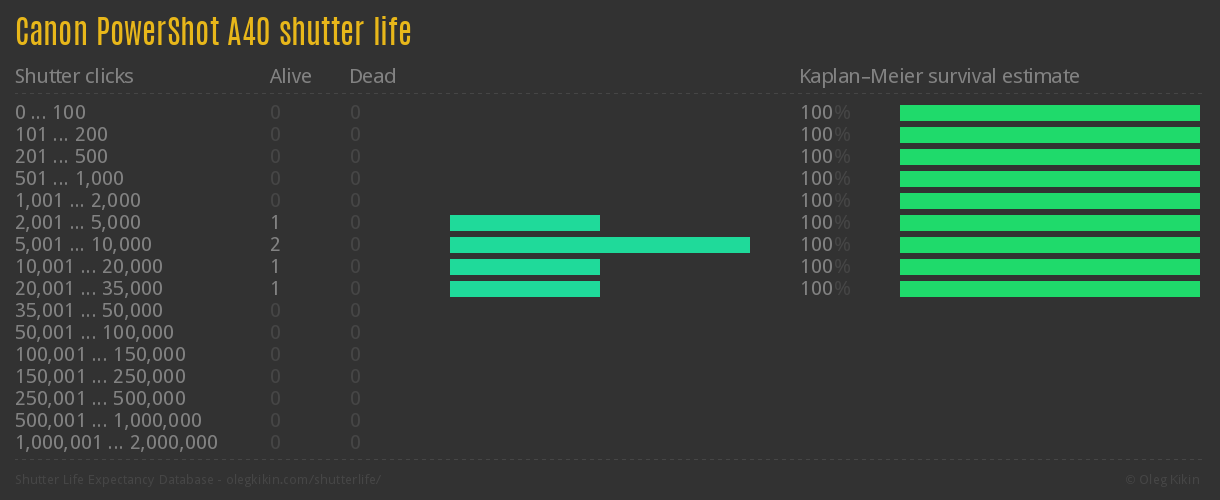 Direct link to this page: Canon PowerShot A40Average number of actuations after which shutter is still alive: 14,340.0