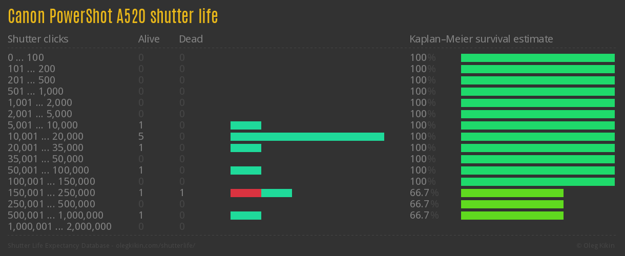Direct link to this page: Canon PowerShot A520Average number of actuations after which shutter is still alive: 107,075.1