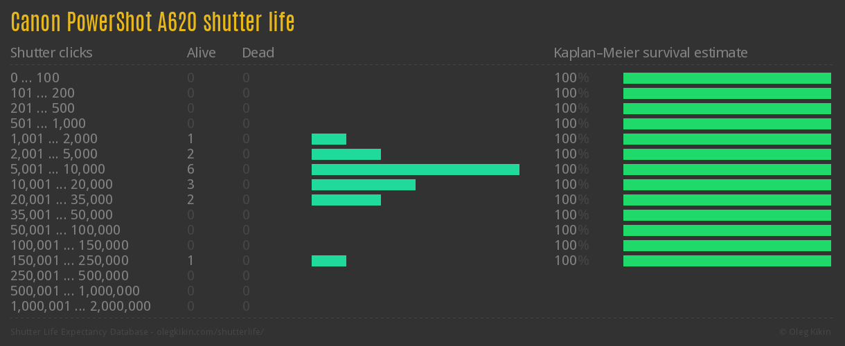 Direct link to this page: Canon PowerShot A620Average number of actuations after which shutter is still alive: 20,147.8