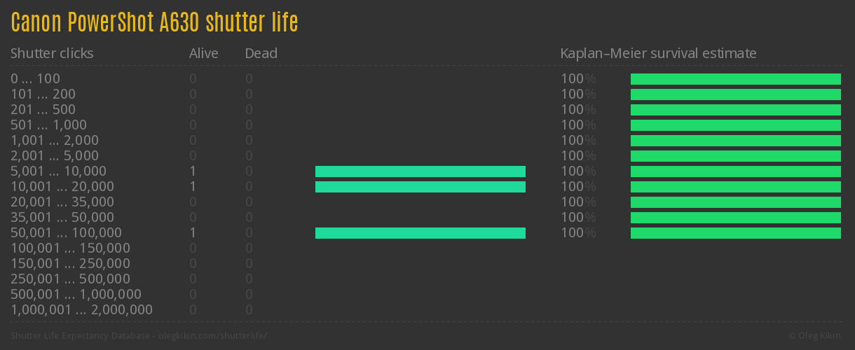 Direct link to this page: Canon PowerShot A630Average number of actuations after which shutter is still alive: 31,333.3