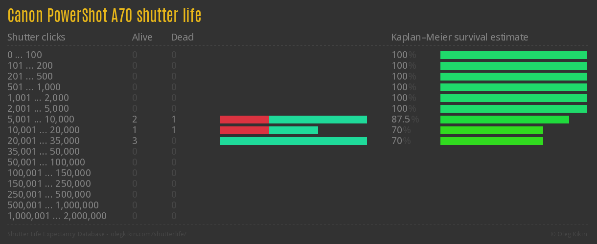 Direct link to this page: Canon PowerShot A70Average number of actuations after which shutter is still alive: 19,866.7