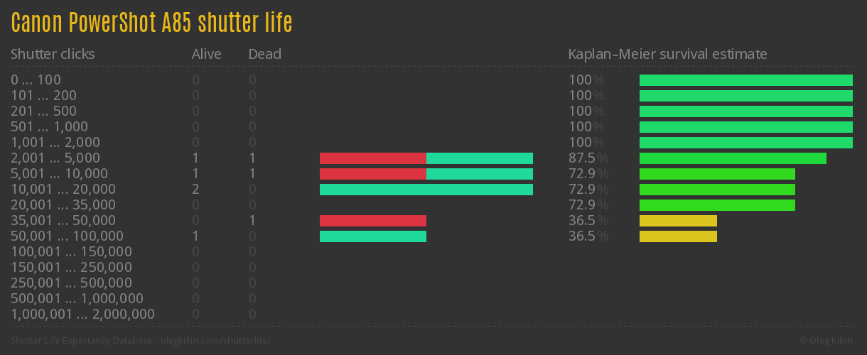 Direct link to this page: Canon PowerShot A85Average number of actuations after which shutter is still alive: 22,457.4