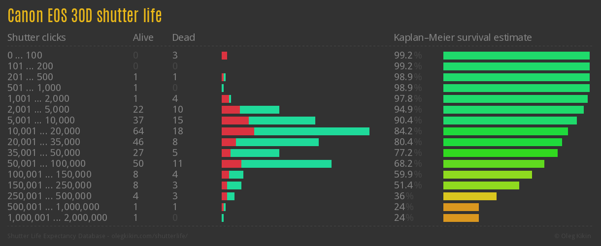 Direct link to this page: Canon EOS 30DAverage number of actuations after which shutter is still alive: 120,030.9