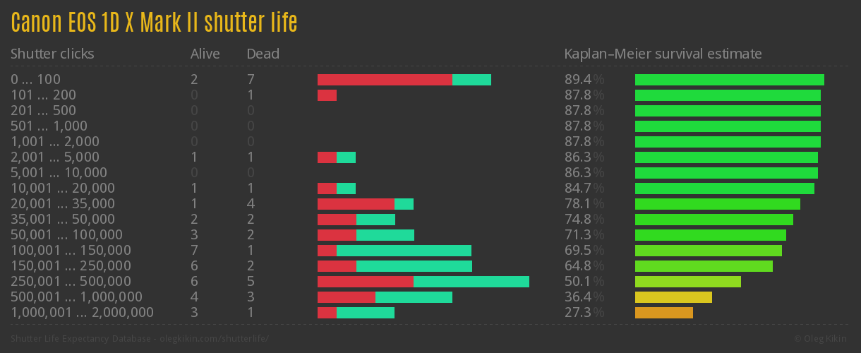 Direct link to this page: Canon EOS 1D X Mark IIAverage number of actuations after which shutter is still alive: 320,371.4