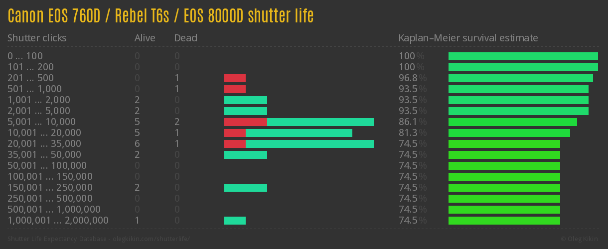 Direct link to this page: Canon EOS 760D / Rebel T6s / EOS 8000DAverage number of actuations after which shutter is still alive: 75,693.4