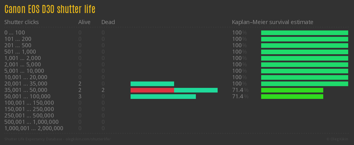 Direct link to this page: Canon EOS D30Average number of actuations after which shutter is still alive: 47,857.1
