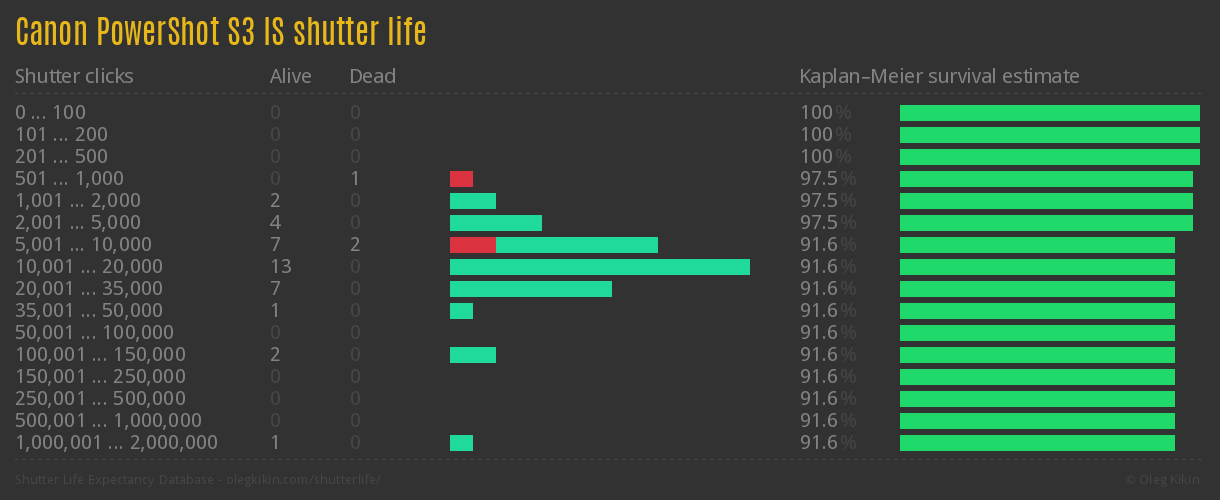 Direct link to this page: Canon PowerShot S3 ISAverage number of actuations after which shutter is still alive: 52,241.6