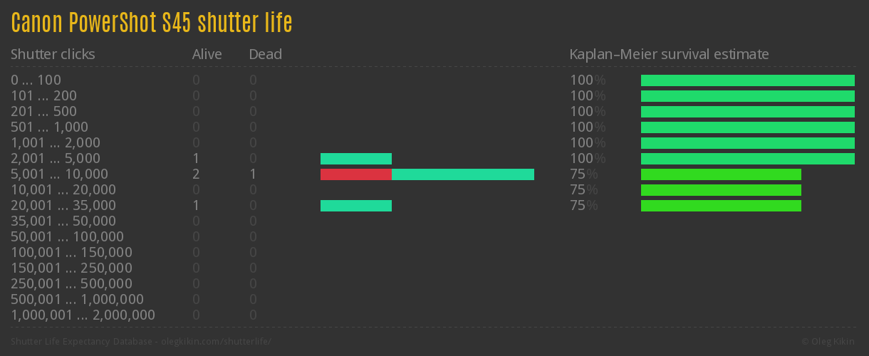 Direct link to this page: Canon PowerShot S45Average number of actuations after which shutter is still alive: 12,797.5