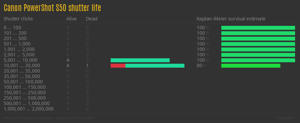 Direct link to this page: Canon PowerShot S50Average number of actuations after which shutter is still alive: 10,030.0