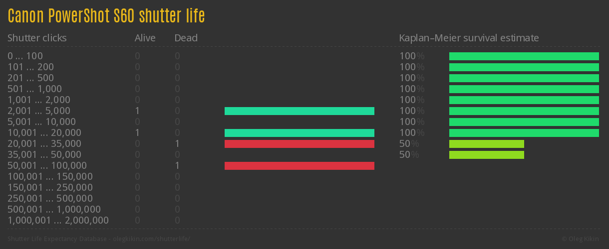 Direct link to this page: Canon PowerShot S60Average number of actuations after which shutter is still alive: 7,933.5