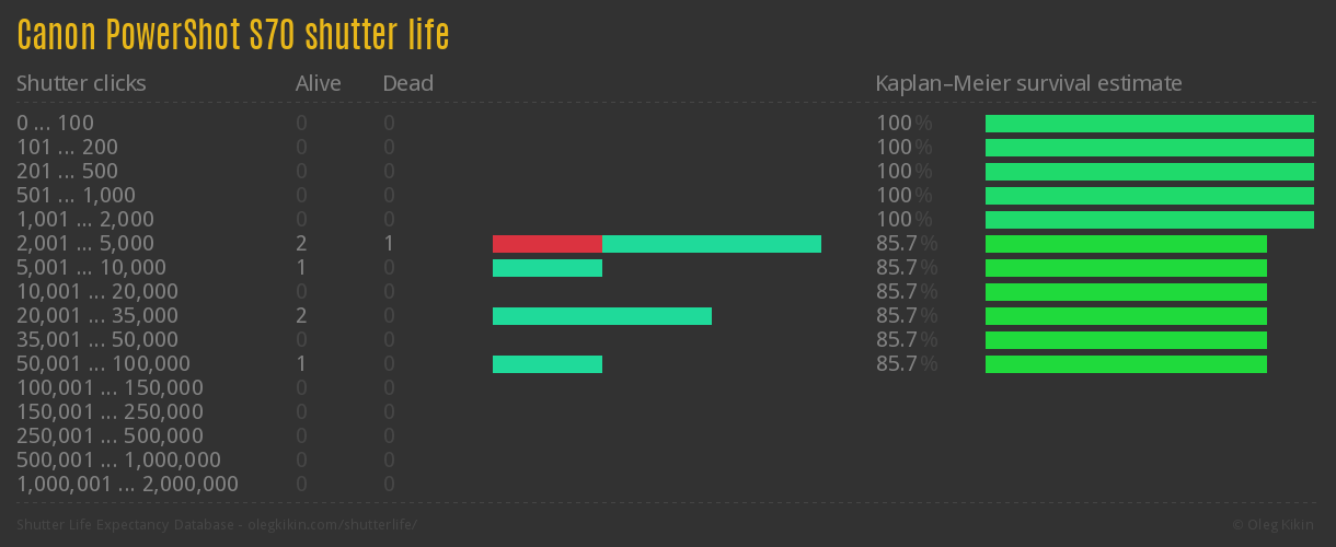 Direct link to this page: Canon PowerShot S70Average number of actuations after which shutter is still alive: 23,050.0