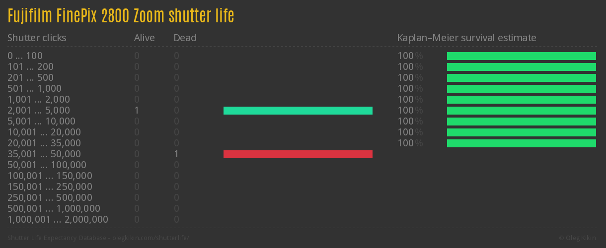 Direct link to this page: Fujifilm FinePix 2800 ZoomAverage number of actuations after which shutter is still alive: 3,000.0