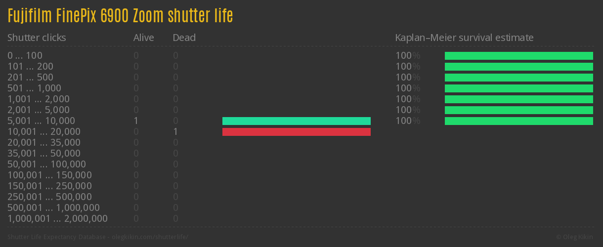 Direct link to this page: Fujifilm FinePix 6900 ZoomAverage number of actuations after which shutter is still alive: 10,000.0
