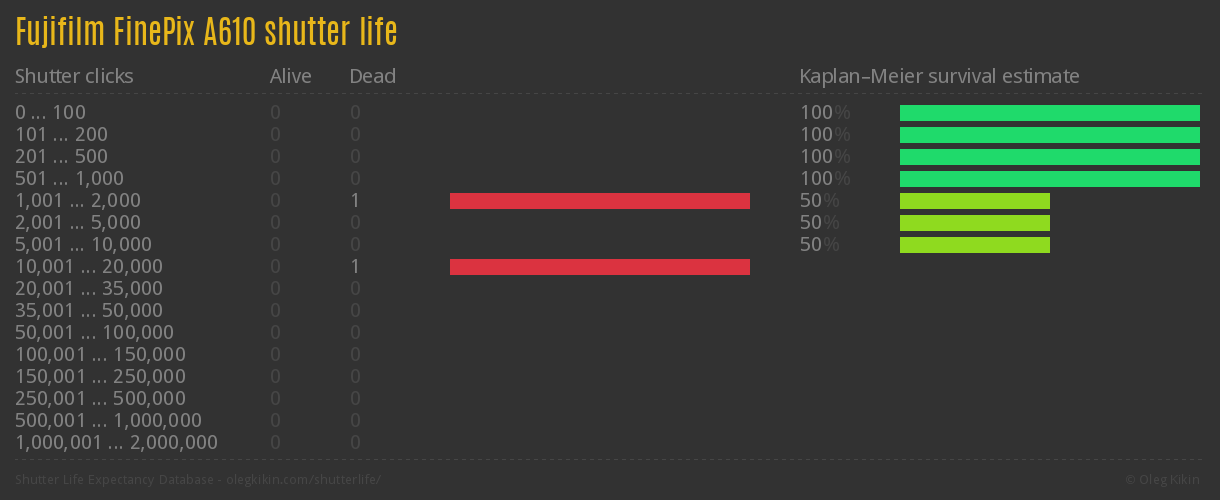 Direct link to this page: Fujifilm FinePix A610Average number of actuations after which shutter is still alive: no data