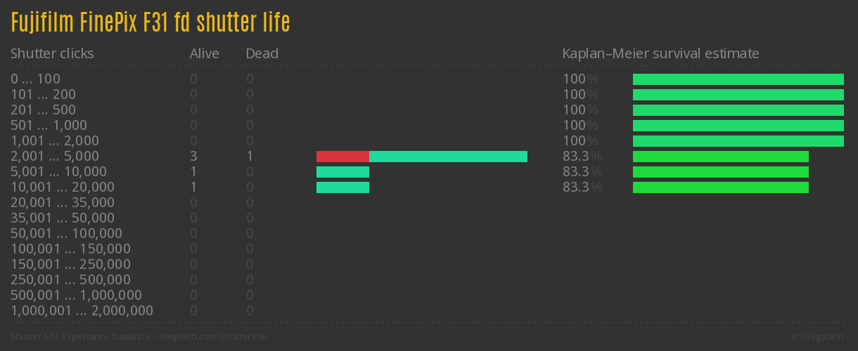 Direct link to this page: Fujifilm FinePix F31 fdAverage number of actuations after which shutter is still alive: 5,701.0