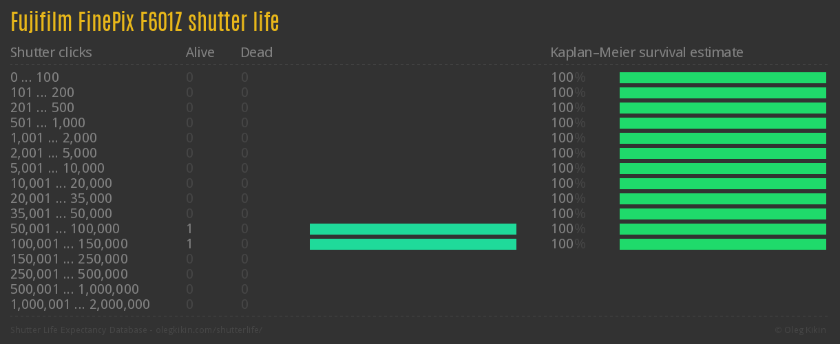 Direct link to this page: Fujifilm FinePix F601ZAverage number of actuations after which shutter is still alive: 98,500.0