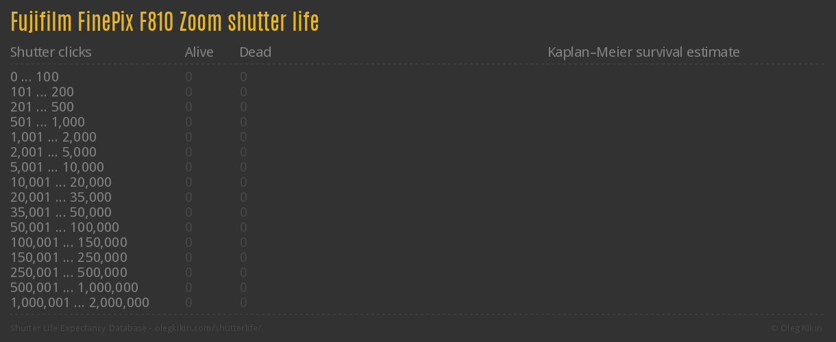 Direct link to this page: Fujifilm FinePix F810 ZoomAverage number of actuations after which shutter is still alive: no data