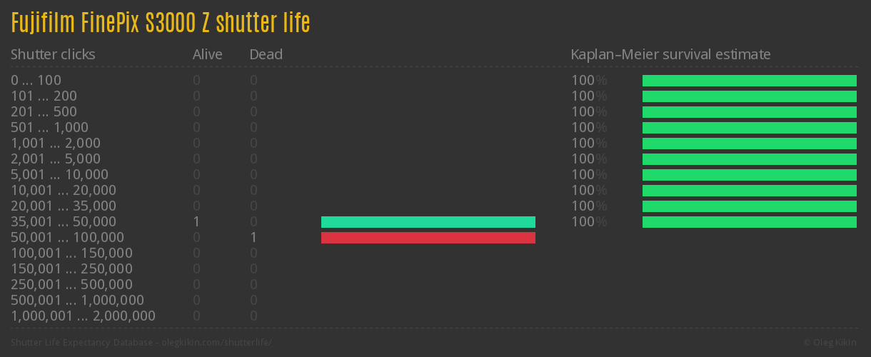 Direct link to this page: Fujifilm FinePix S3000 ZAverage number of actuations after which shutter is still alive: 48,000.0