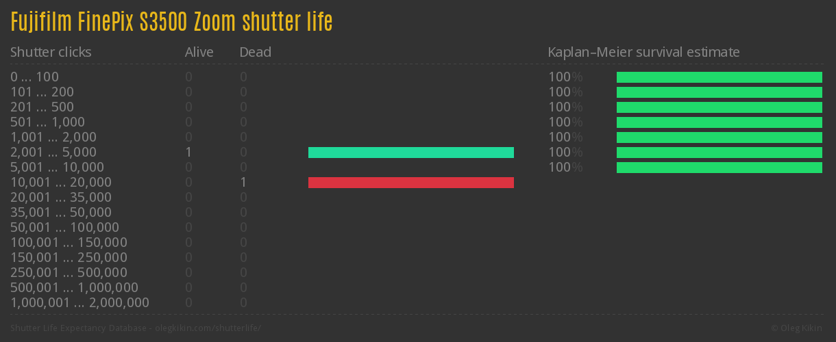 Direct link to this page: Fujifilm FinePix S3500 ZoomAverage number of actuations after which shutter is still alive: 2,491.0