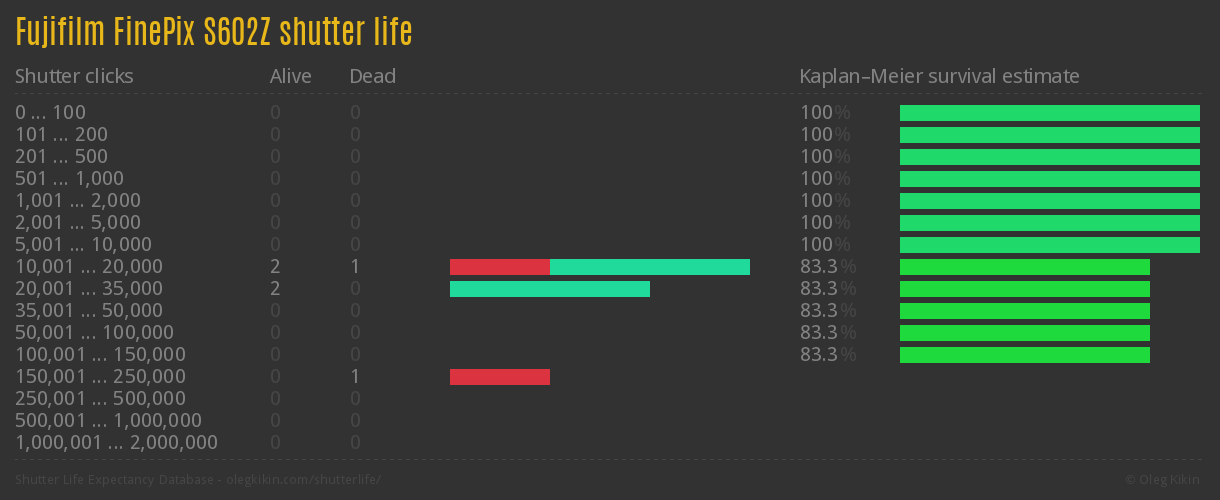 Direct link to this page: Fujifilm FinePix S602ZAverage number of actuations after which shutter is still alive: 21,250.0