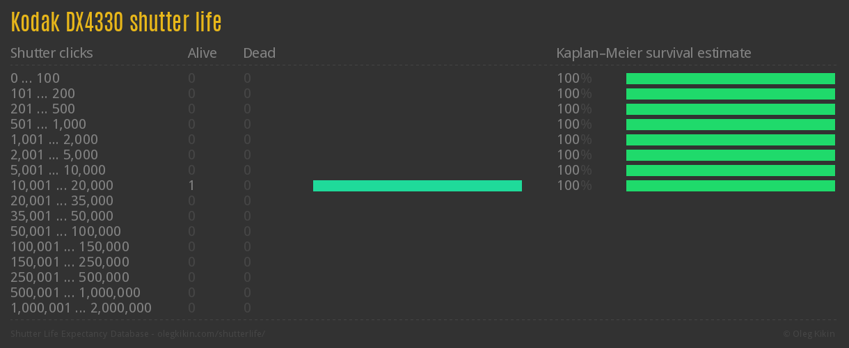 Direct link to this page: Kodak DX4330Average number of actuations after which shutter is still alive: 10,981.0