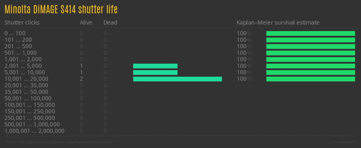 Direct link to this page: Minolta DiMAGE S414Average number of actuations after which shutter is still alive: 9,568.0