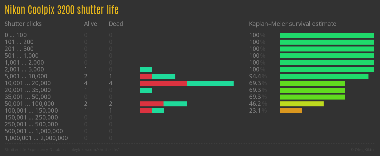 Direct link to this page: Nikon Coolpix 3200Average number of actuations after which shutter is still alive: 33,511.7