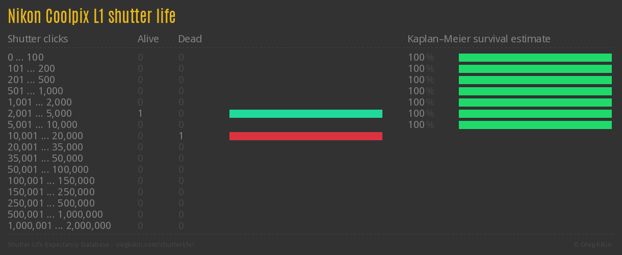 Direct link to this page: Nikon Coolpix L1Average number of actuations after which shutter is still alive: 3,000.0