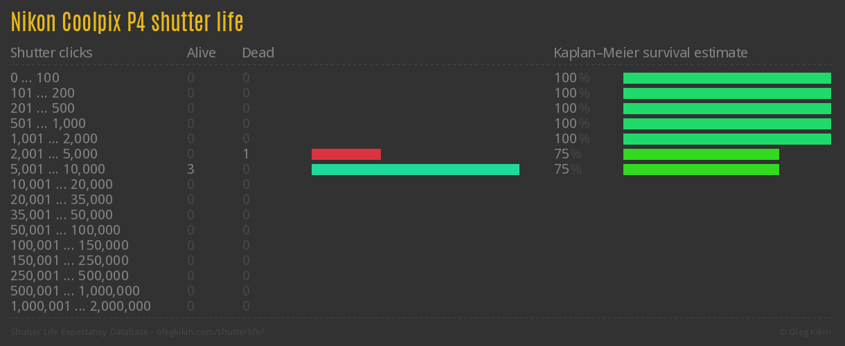 Direct link to this page: Nikon Coolpix P4Average number of actuations after which shutter is still alive: 8,758.0