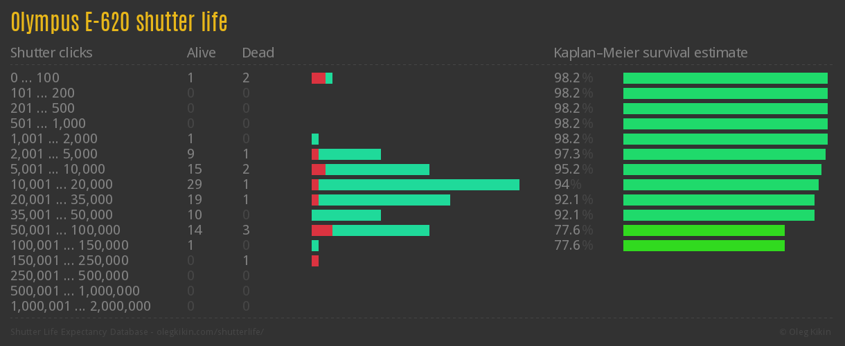 Direct link to this page: Olympus E-620Average number of actuations after which shutter is still alive: 26,199.2