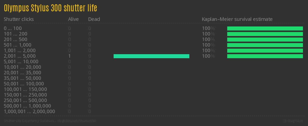 Direct link to this page: Olympus Stylus 300Average number of actuations after which shutter is still alive: 3,000.0