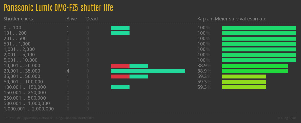 Direct link to this page: Panasonic Lumix DMC-FZ5Average number of actuations after which shutter is still alive: 33,129.8