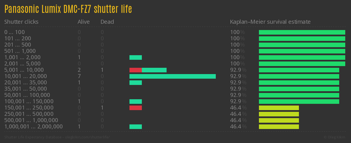 Direct link to this page: Panasonic Lumix DMC-FZ7Average number of actuations after which shutter is still alive: 115,732.7